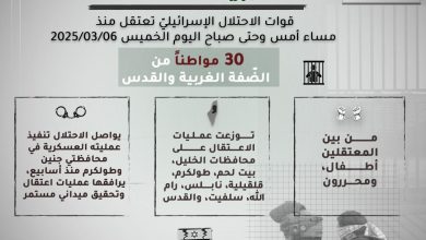 قوات الاحتلال الإسرائيلي تشن حملة مداهمات واعتقالات واسعة في مدن وقرى محافظات الضفة الغربية والقدس المحتلتين طالت 30 مواطنُا، وتعيث…