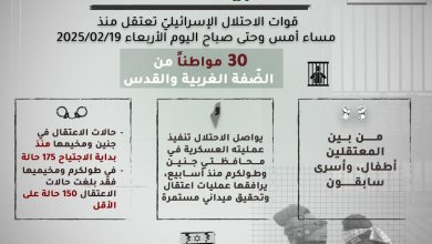 شنت قوات الاحتلال الإسرائيلي حملة اعتقالات واحتجاز للساعات طويلة، منذ مساء أمس وحتّى صباح اليوم الأربعاء طالت (30) مواطناً على…