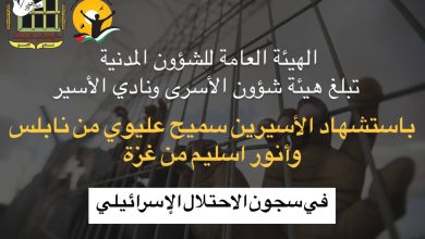 أبلغت الهيئة العامة للشؤون المدنية، هيئة شؤون الأسرى والمحررين ونادي الأسير الفلسطيني، باستشهاد أسيرين في سجون الاحتلال وهما: سميح سليمان…