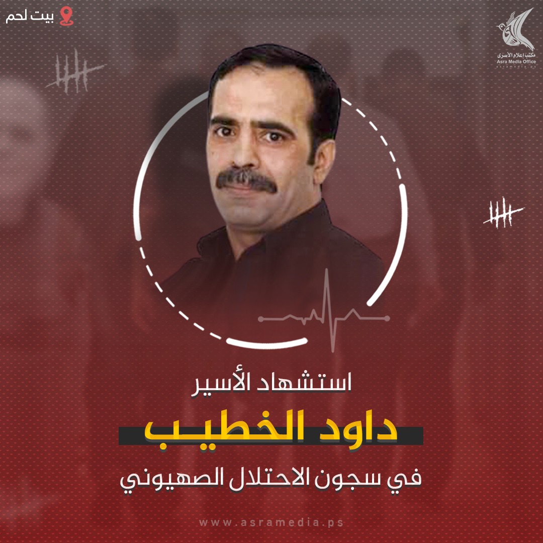 استشهد مساء الأربعاء 2 سبتمبر 2020، الأسير داود طلعت الخطيب 46 عاما في سجن عوفر الصهيوني نتيجة تعرضه لجلطة قلبية حادة بسبب الاهمال الطبي المتعمد.
