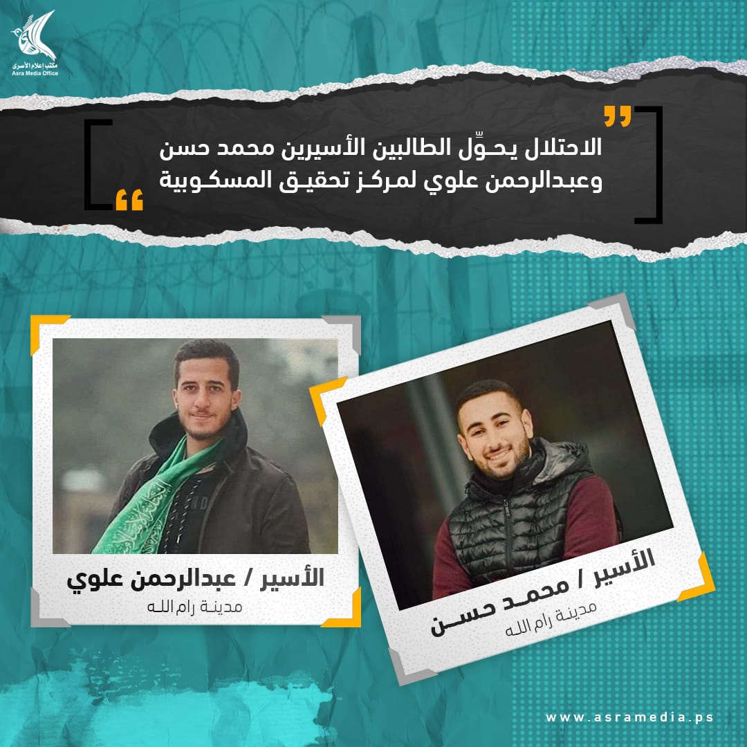 نقلت قوات الاحتلال الأسيرين الطالبين في جامعة بيرزيت محمد ماجد حسن وعبد الرحمن علوي من مدينة رام الله؛ إلى مركز المسكوبية للتحقيق.