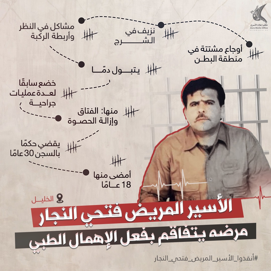 نتيجة سياسة الإهمال الطبي التي تتبعها إدارة السجون بحق الأسرى، تراجعت الحالة الصحية للأسير فتحي محمد النجار (53 عاما) من مدينة يطا في الخليل، في الأيام الأخيرة الى حد كبير في سجن النقب.