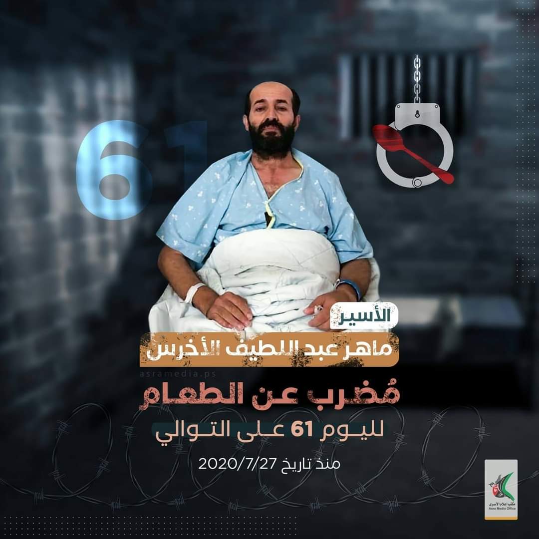 يواصل الأسير “ماهر عبد اللطيف الأخرس” من سيلة الظهر قضاء مدينة جنين إضرابه المفتوح عن الطعام لليوم 65 على التوالي وسط تراجع خطير على وضعه الصحي ، ولم يطرأ أي جديد بخصوص إيجاد حل لقضيته .