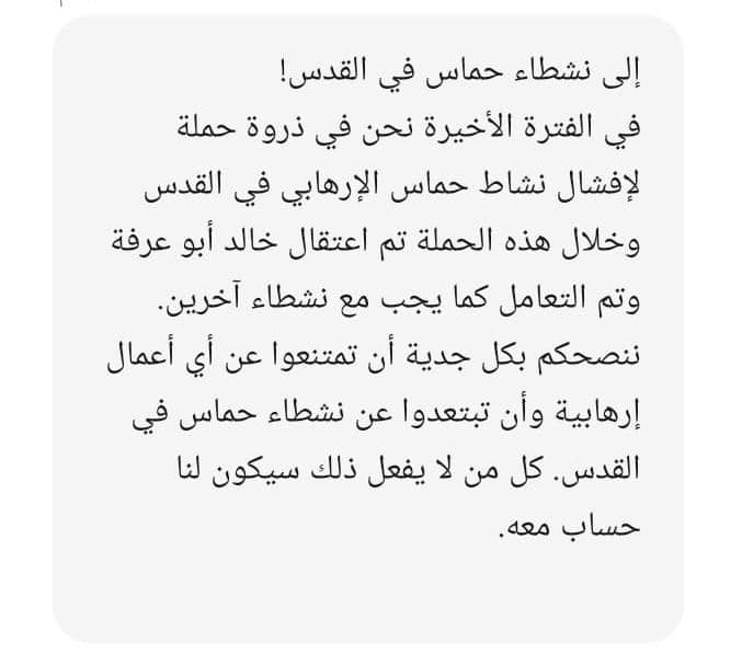 وجاء في نص الرسالة:” إلى نشطاء حماس في القدس، في الفترة الأخيرة محن في ذروة حملة لإفشال نشاط حماس الإرهابي في القدس وخلال هذه الحملة تم اعتقال خالد أبو عرفة وتم التعامل كما يجب مع نشطاء آخرين. ننصحكم بكل جدية أن تمتنعوا عن أي أعمال إرهابية وأن تبتعدوا عن نشطاء حماس في القدس. كل من لا يفعل ذلك سيكون لنا حساب معه”.