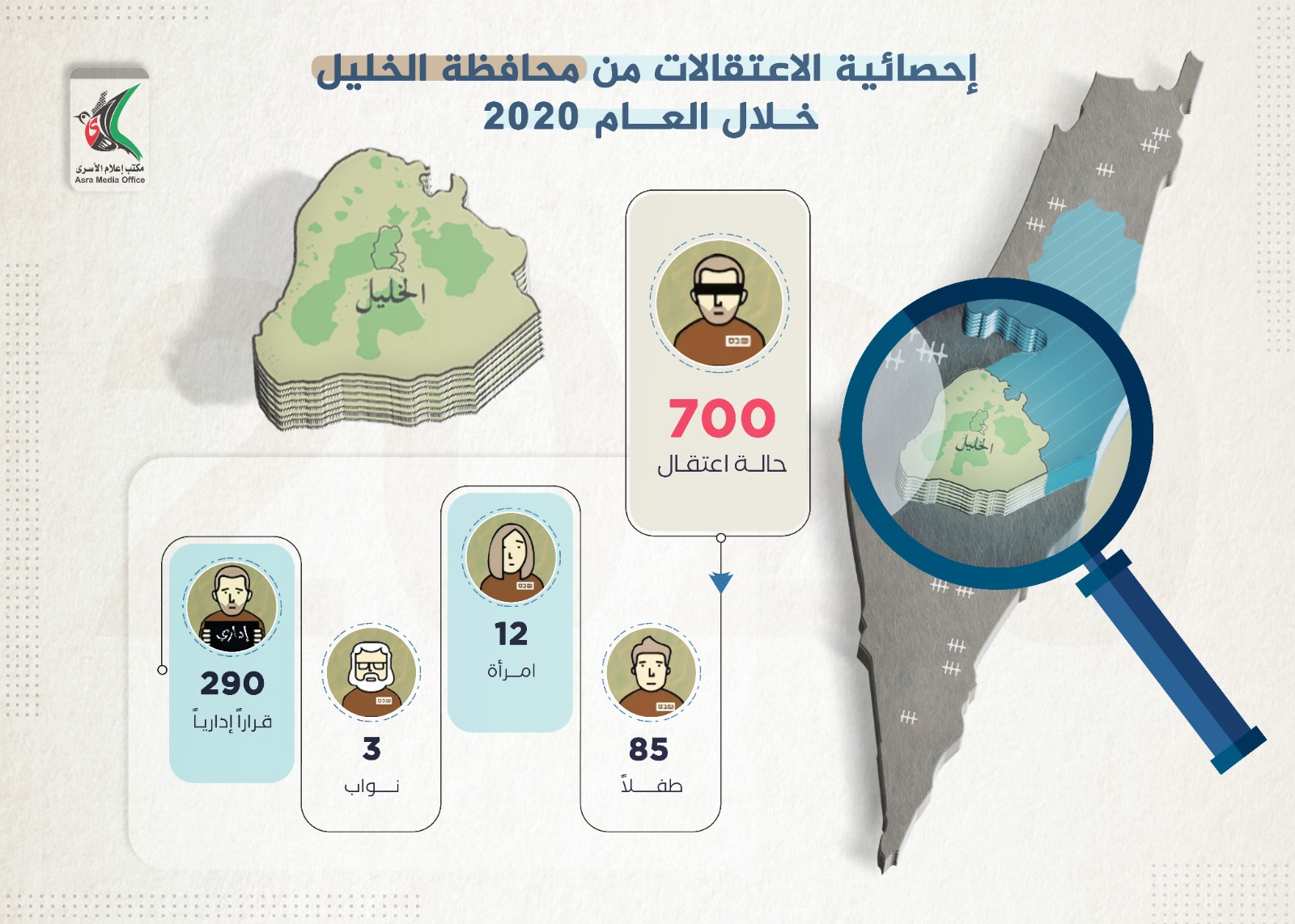 أكد مكتب إعلام الأسرى بأن سلطات الاحتلال واصلت خلال العام 2020 حملات الاعتقالات بحق المواطنين من مدينة الخليل، والتي تعتبر من أكثر المدن الفلسطينية التي تتعرض للاستنزاف البشرى بعد مدينة القدس حيث رصد (700) حالة اعتقال من المدينة خلال العام المنصرم .