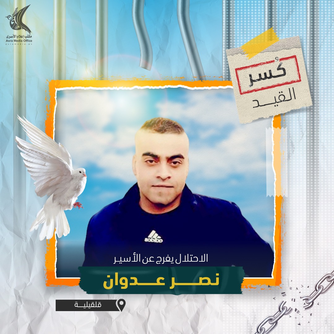 أفرجت سلطات الاحتلال اليوم الأحد 7/2/2021 عن الأسير “نصر حامد أبو عدوان” من قلقيلية بعد اعتقال استمر 13 شهراً.