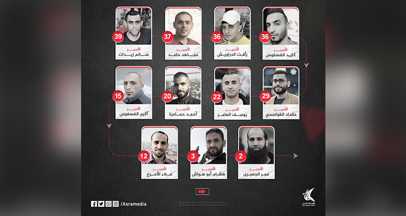 وقال مراسل مكتب إعلام الأسرى إن الأسير سالم زيدات من بلدة بني نعيم شرق الخليل مضرب عن الطعام منذ 39 يومًا، فيما يواصل الأسير مجاهد حامد من بلدة سلواد شرق رام الله إضرابه عن الطعام منذ 37 يوما، والأسيران كايد الفسفوس ورأفت الدراويش من دورا جنوب الخليل منذ ٣٦ يوما.