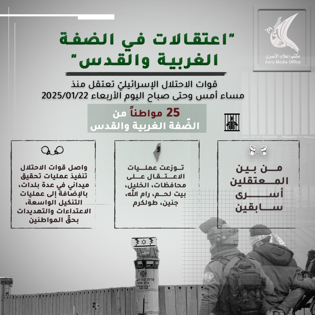 اعتقلت قوات الاحتلال الإسرائيلي منذ مساء أمس وحتّى صباح اليوم الأربعاء (25) مواطناً على الأقل من الضّفة الغربية والقدس المحتلتين، بينهم أسرى سابقون.