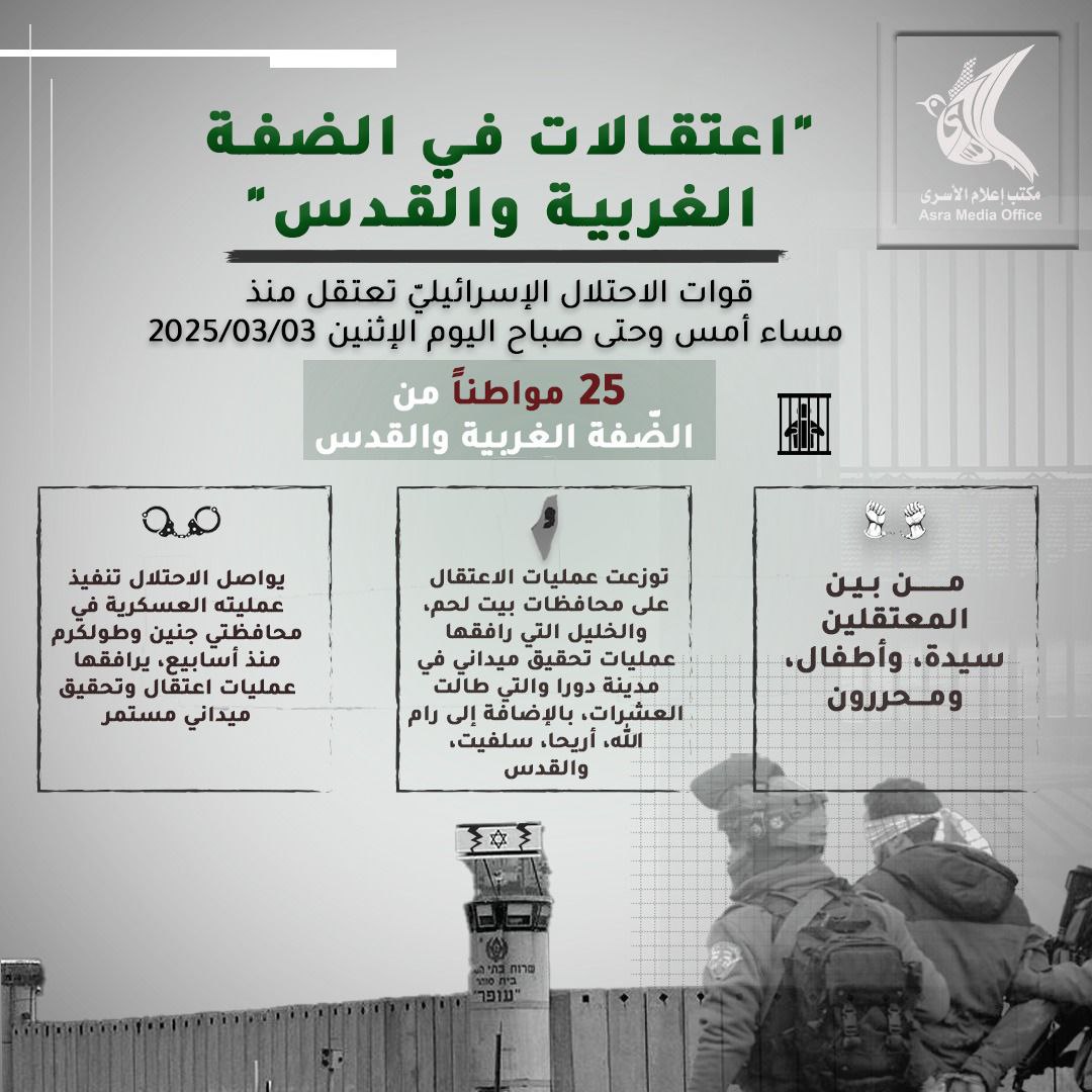 اعتقلت قوات الاحتلال الإسرائيلي منذ مساء أمس وحتّى صباح اليوم الاثنين (25) مواطناً على الأقل من الضّفة، بينهم سيدة، وأطفال، بالإضافة إلى أسرى سابقين.
