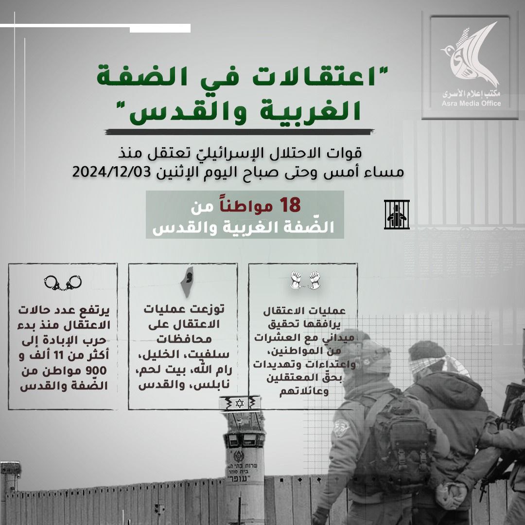 يُشار إلى أنّ حصيلة الاعتقالات منذ بدء حرب الإبادة المستمرة والعدوان الشامل على أبناء شعبنا بلغ أكثر من 11 ألف و900، من الضّفة بما فيها القدس، والتي شملت فئات المجتمع الفلسطينيّ كافة، فيما لم نتمكن كمؤسسات حتّى اليوم من حصر حالات الاعتقال من غزة والتي تقدر بالآلاف، جراء تنفيذ الاحتلال جريمة الإخفاء القسري بحقهم.