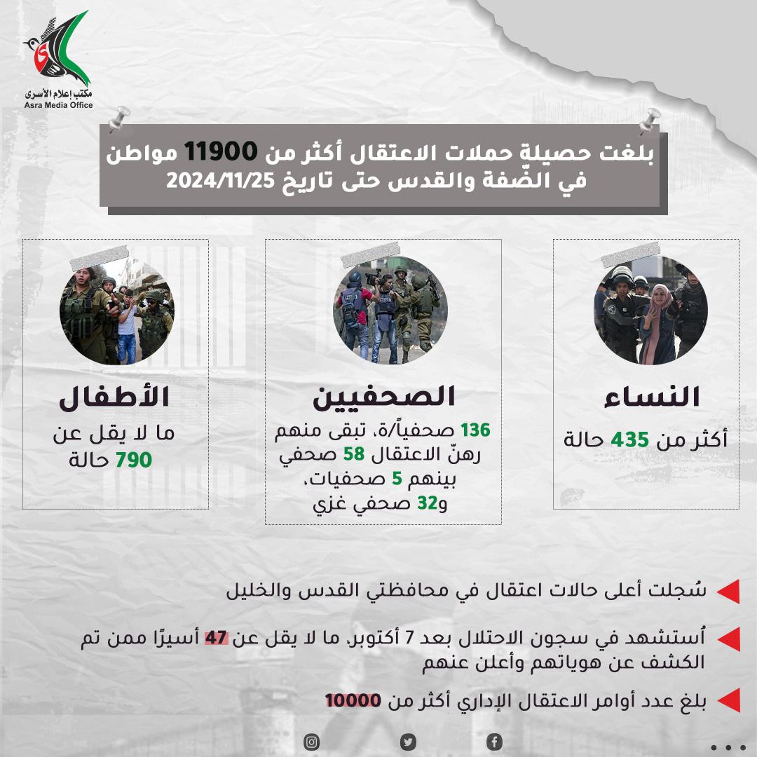 بلغت حصيلة حملات الاعتقال أكثر من 11 ألف و900 حالة اعتقال في الضّفة بما فيها القدس
