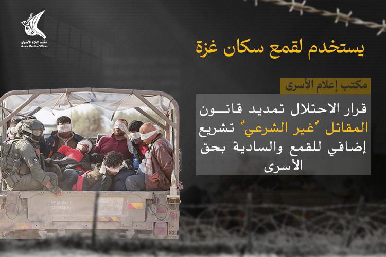 أكد مكتب إعلام الأسرى، الخميس 24 يوليو 2025، أن قرار الاحتلال تمديد قانون المقاتل “غير الشرعي” تشريع إضافي لزيادة القمع والوحشية والتعذيب والإخفاء القسري بحق معتقلي قطاع غزة.