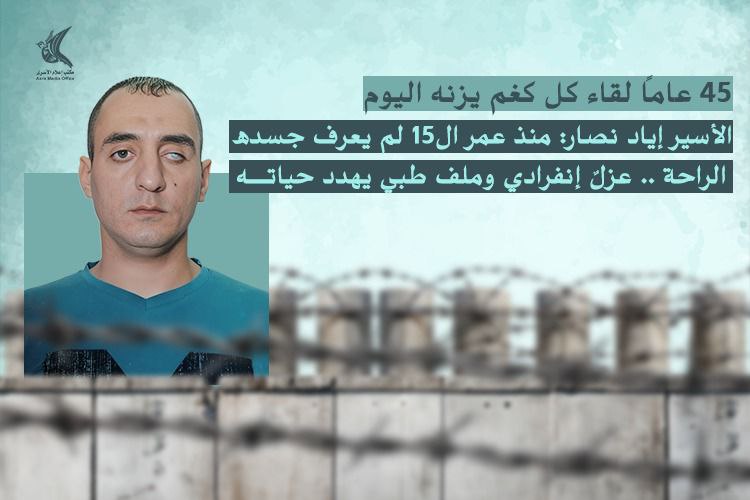 مكتب إعلام الأسرى يسلط الضوء عليهم في سلسلة تسرد تضحيات الأسرى المعزولين والقيادات وأصحاب الأحكام المؤبدة اللامنطقية، على جملة من الأسرى وقصصهم وقصص عزلهم وتنقلاتهم وظروف الإهمال الطبي الذي يتعرضون له، ومنهم الأسير إياد محمود صالح نصار(45 عاماً) سكان طولكرم، صاحب حكم ال30 عاماً، الحكم الذي حصل عليه حتى بعد طول عناء وطول استئناف، إياد أحد الأسرى المجهولين في معركة الشعب الفلسطيني، اسم لم ينل حظه من المعرفة رغم عمق التضحيات وسوء ما يتعرض له في سجون الاحتلال.