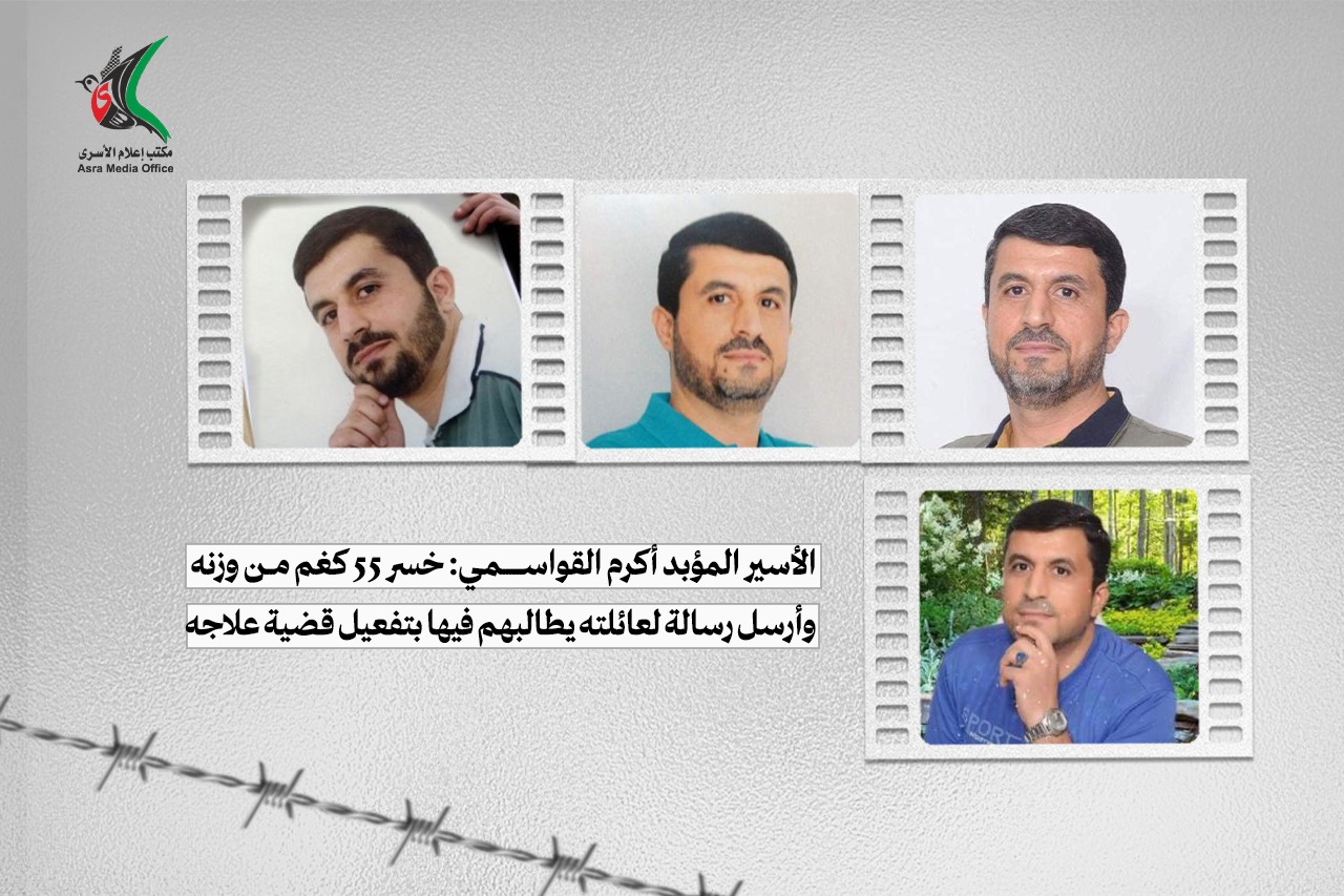 الأسير المؤبد أكرم القواسمي: خسر 55 كغم من وزنه وأرسل رسالة لعائلته يطالبهم فيها بتفعيل قضية علاجه.