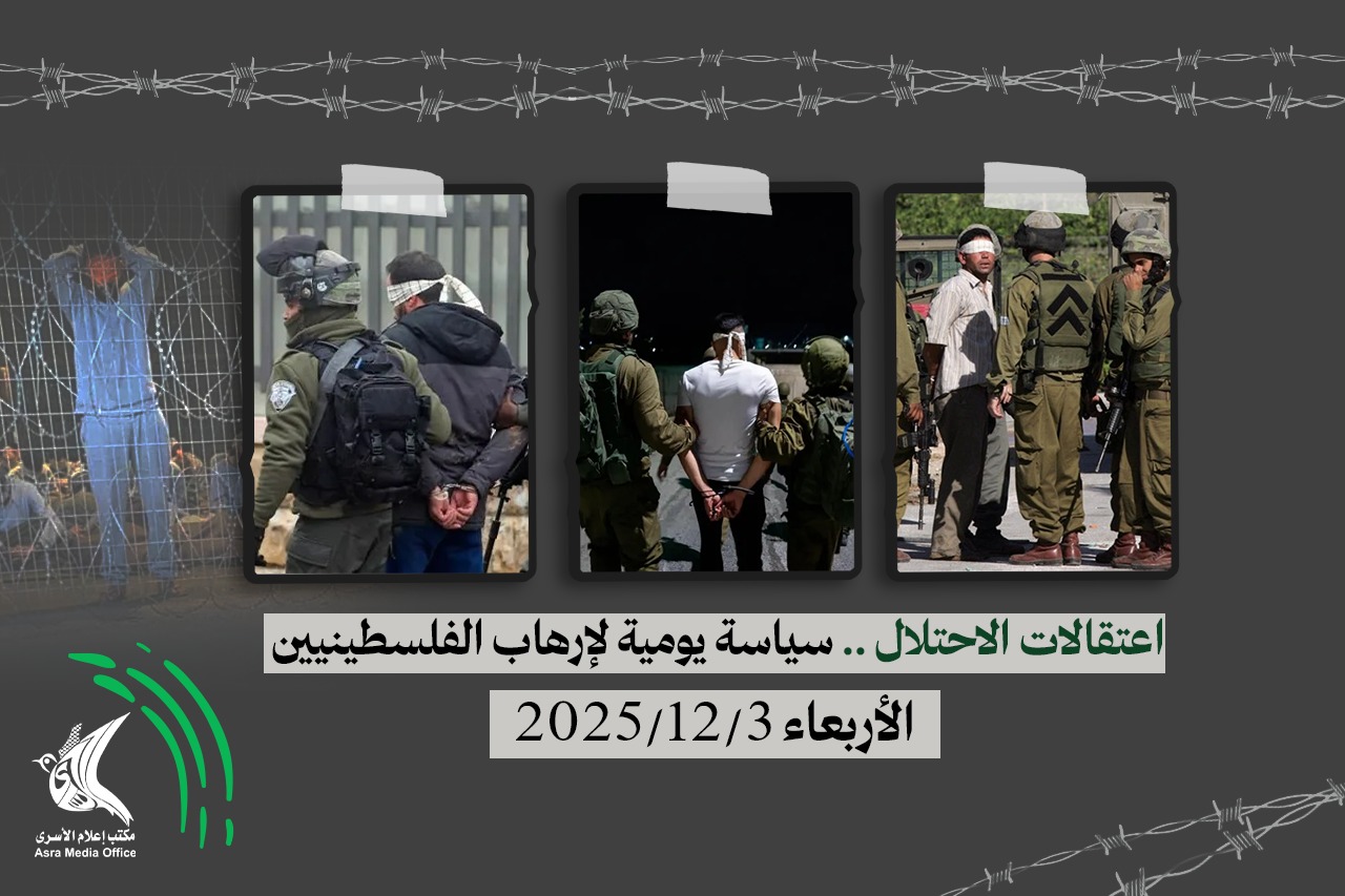 نفّذت قوات الاحتلال الإسرائيلي، اليوم الأربعاء 3 ديسمبر 2025، حملة اعتقالات واسعة طالت عدداً من المواطنين في محافظات مختلفة من الضفة الغربية المحتلة، ترافقها اقتحامات للمنازل وتفتيش وتخريب للأثاث، إضافة إلى اعتداءات على المعتقلين واحتجازهم في ظروف قاسية. وتركّزت الحملة في محافظات الخليل ونابلس وبيت لحم، مع اعتقالات محدودة في جنين وسلفيت.