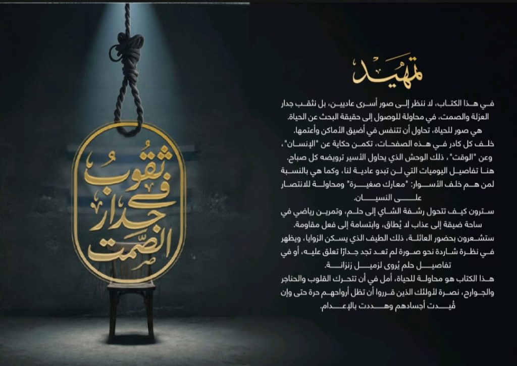 أصدر مكتب إعلام الأسرى، أبريل 2026، كتابًا جديدًا بعنوان “ثقوب في جدران الصمت”، يوثق فيه جانبًا من معاناة الأسرى الفلسطينيين داخل سجون الاحتلال، بأسلوب بصري وإنساني يعكس تفاصيل الحياة خلف القضبان.