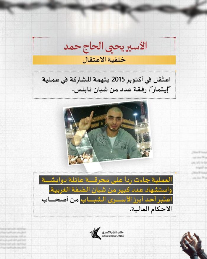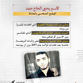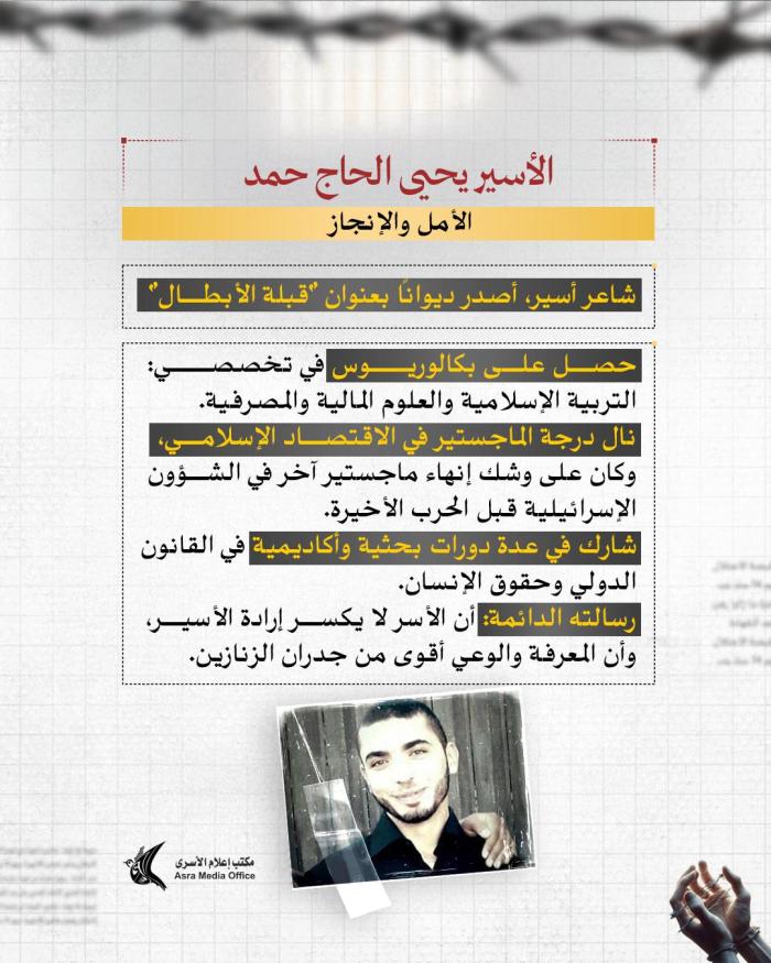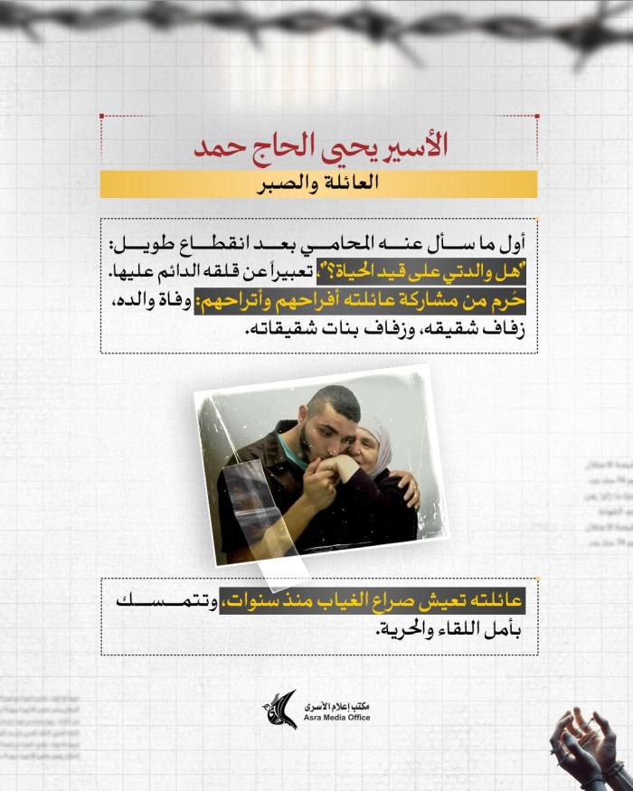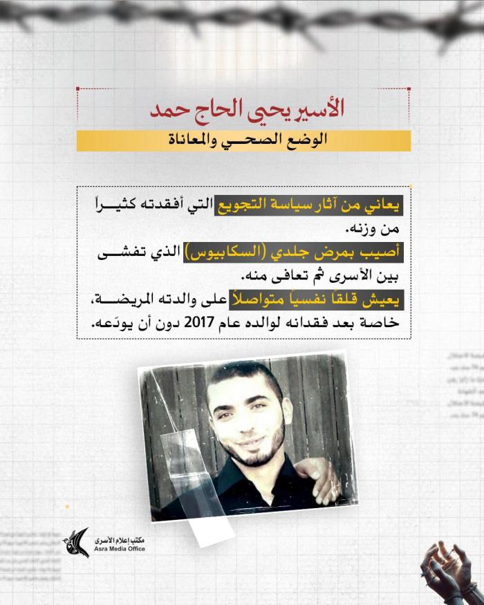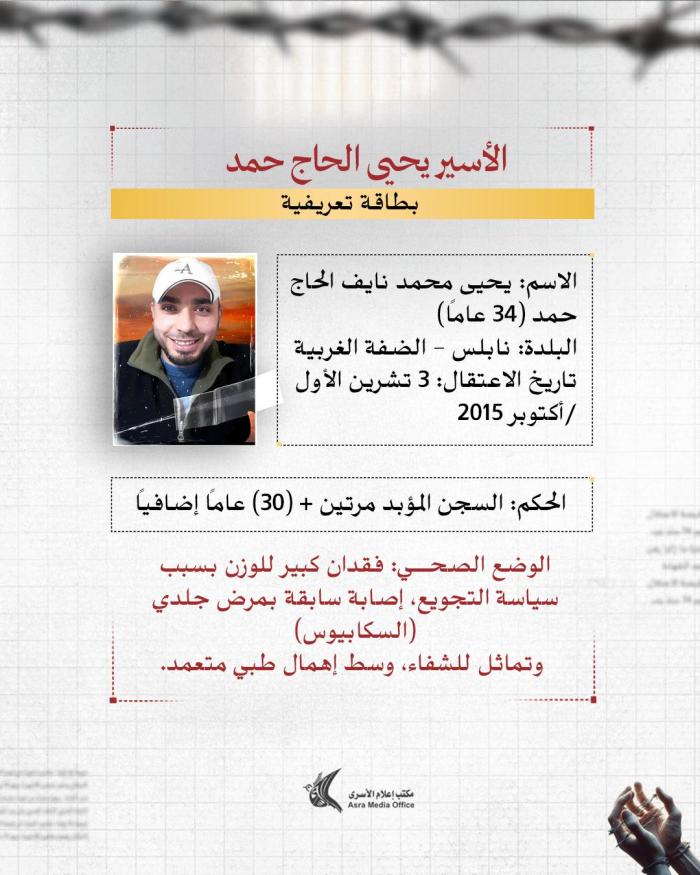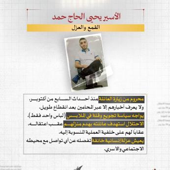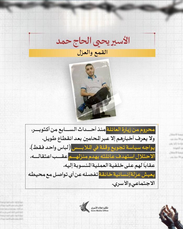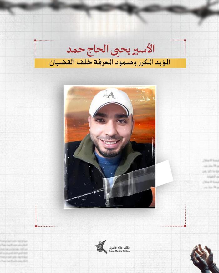 منذ 10 ساعات إعلام الأسرى: يتعرض الأسير يحيى حاج حمد لسياسة تجويع ممنهجة أفقدته الكثير من وزنه، ويُحرم من الزيارة والاتصال بعائلته منذ أحداث السابع من أكتوبر، ما زاد من معاناته النفسية وقلقه المستمر على والدته المريضة.