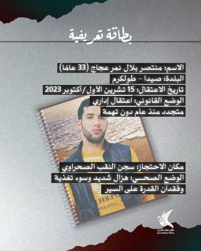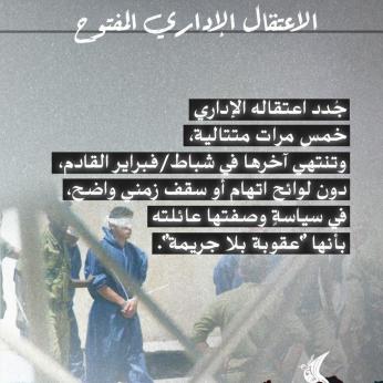 منذ 18 ساعة للمرة السادسة على التوالي.. تجديد الاعتقال الإداري بحق الأسير بهاء عماد قعدان من طولكرم لمدة أربعة أشهر إضافية، وهو معتقل منذ 32 شهراً