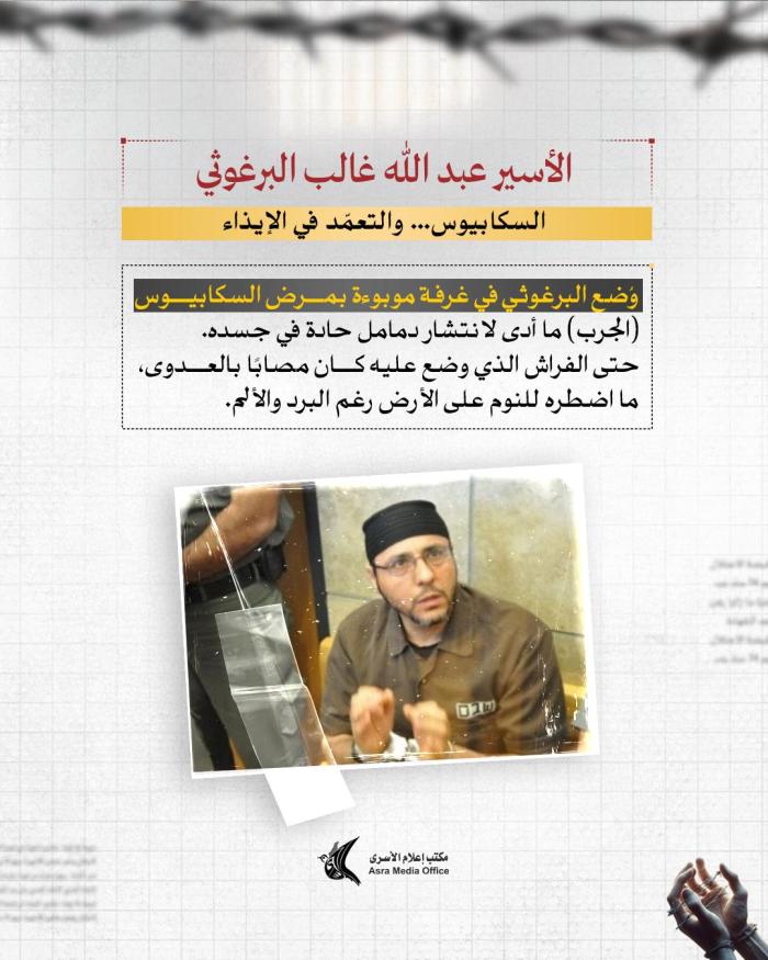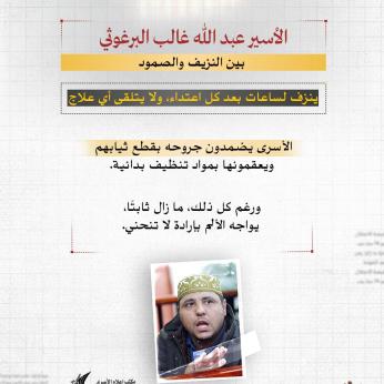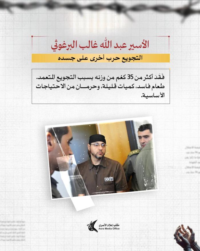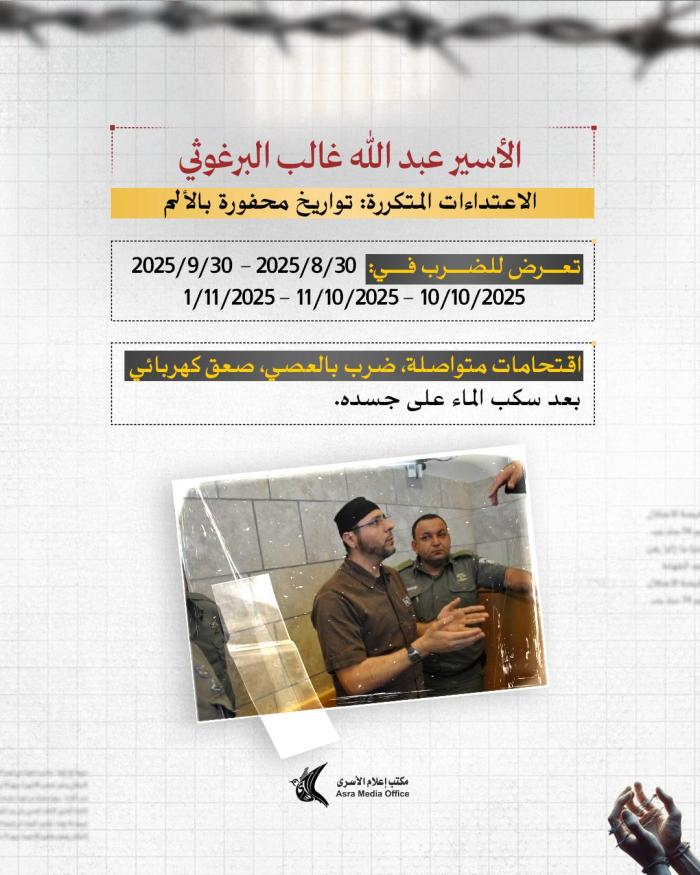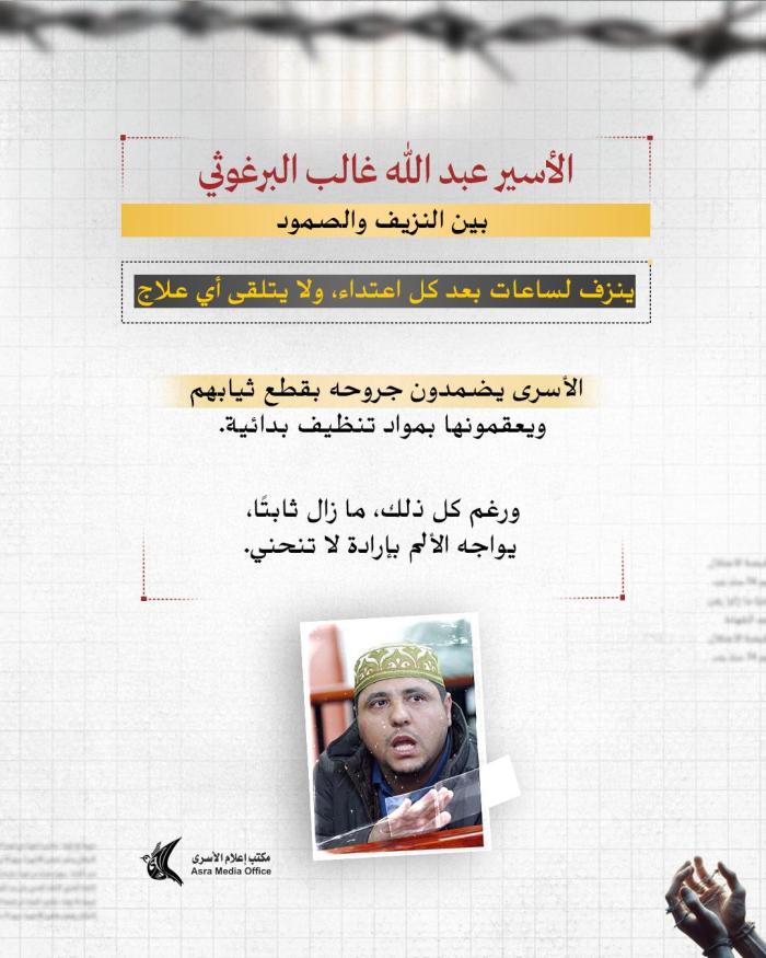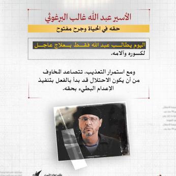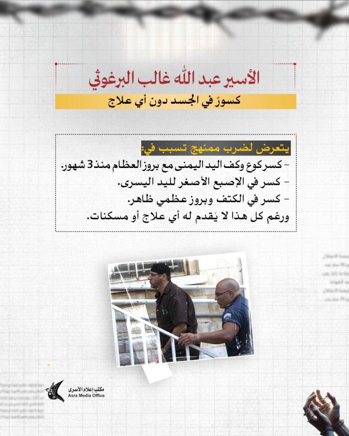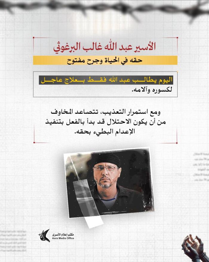 منذ ساعة إعلام الأسرى: يعاني البرغوثي من نزيف وجروح وكسور وتمزق في أوتار اليد يعجز الأسرى عن علاجها إلا بقطع ملابس ممزقة ومواد تنظيف بدائية فقط