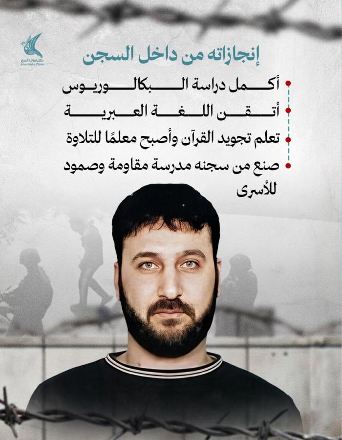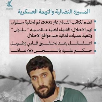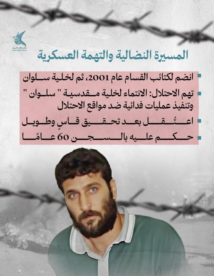 منذ يومين إعلام الأسرى: معتقل منذ 19/11/2015 بتهمة تنفيذ عملية قتل فيها مستوطنان، ومحكوم بالمؤبد مرتين و20 عامًا إضافية، وهُدم منزله عام 2016 وأعادت العائلة بناءه.