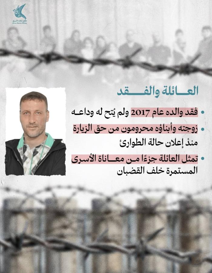 منذ يومين إعلام الأسرى: عائلته تؤكد سوء الأوضاع: منع الاستحمام الدافئ، حالة طوارئ دائمة، منع الحلاقة، قمع وتفتيش مستمر، وشطب اسمه من إحدى صفقات التبادل ولم يظهر في "طوفان الأحرار".