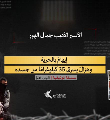 - منذ 6 ساعات إعلام الأسرى: الأسير القائد جمال عبد الفتاح الهور (55 عامًا) من بلدة صوريف شمال الخليل، والمحكوم بالسجن المؤبد خمس مرات و(18) عامًا إضافية، يواجه أوضاعًا صحيةً وإنسانيةً بالغة الخطورة في سجن شطة، بعد فقدانه أكثر من 35 كيلوغرامًا من وزنه نتيجة سياسة التجويع والإهمال الطبي المتعمد.