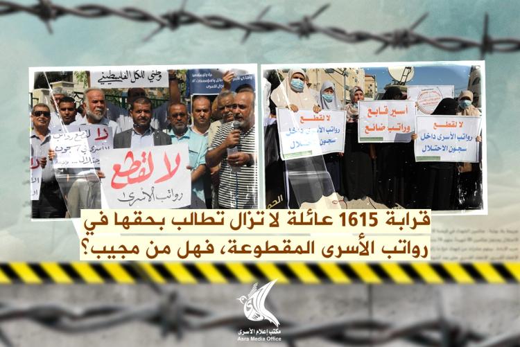 لا تزال قضية قطع رواتب الأسرى حاضرة في الشارع الفلسطيني، تؤرق أهالي الأسرى الذين أخذوا على عاتقهم تنظيم وقفاتٍ احتجاجية للمطالبة بصرف رواتب نحو (1615) أسيرًا تم قطع رواتبهم دون وجود سبب محدد.