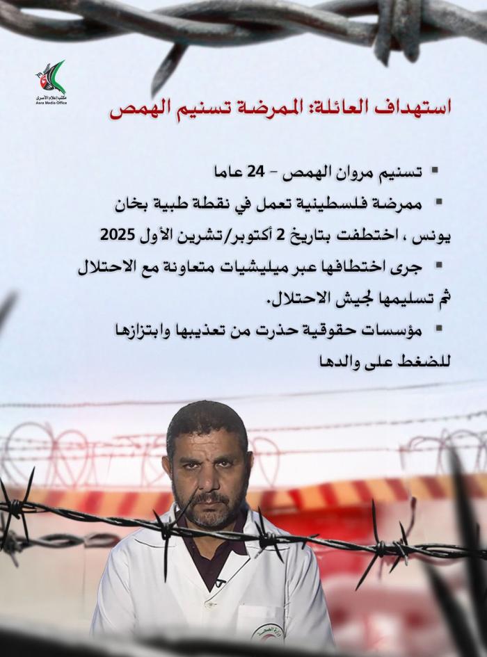 منذ 5 ساعات أبلغ أسيران محرران من سجن نفحة – قسم (17) زوجة الأسير المؤبد أحمد محمد زيدات (26 عامًا)، من بلدة بني نعيم قضاء مدينة الخليل، بأن زوجها أصيب بمرض “سكابيوس” (الجرب) داخل السجن.