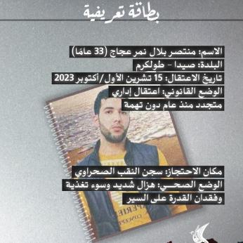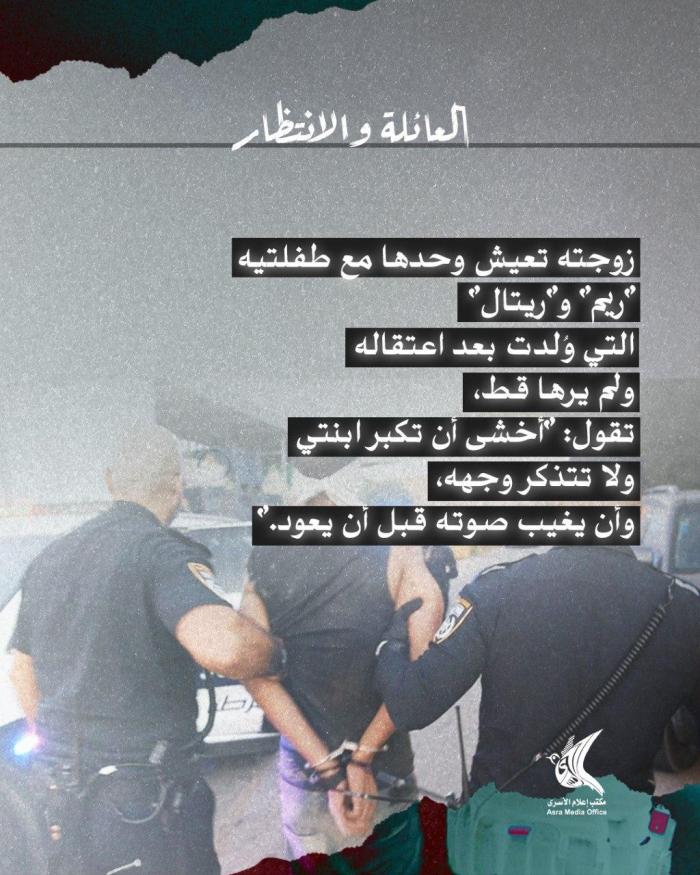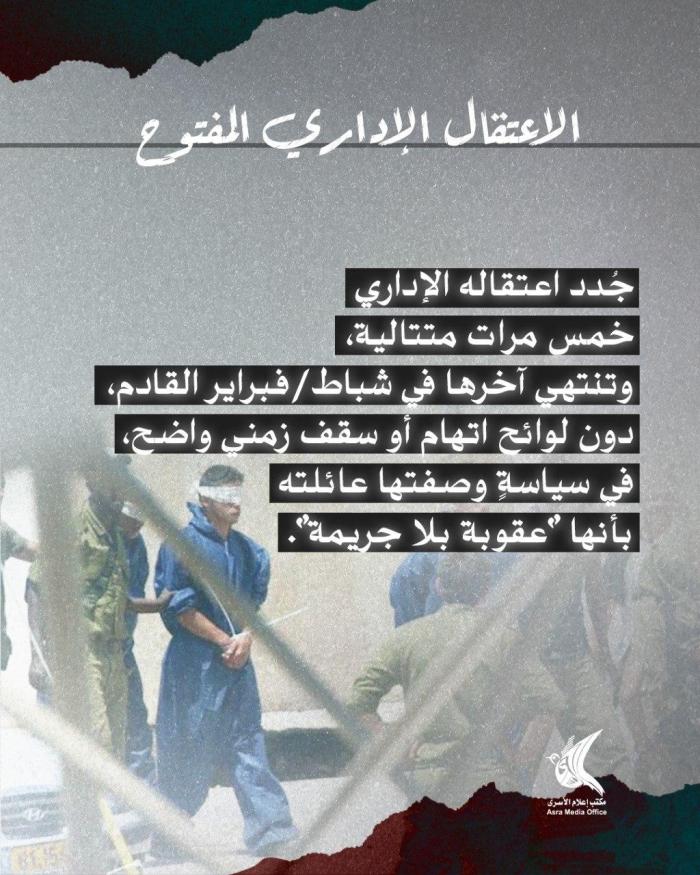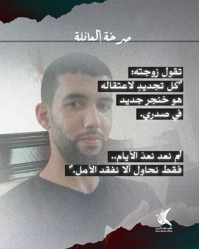 منذ 18 ساعة للمرة السادسة على التوالي.. تجديد الاعتقال الإداري بحق الأسير بهاء عماد قعدان من طولكرم لمدة أربعة أشهر إضافية، وهو معتقل منذ 32 شهراً