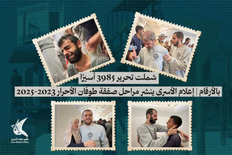 أكد مكتب إعلام الأسرى، أن 3985 أسيرا فلسطينيا تحرروا في صفقة طوفان الأحرار على ثلاث مراحل، وذلك نتاج ملحمة بطولية سطرها أبناء الشعب الفلسطيني بدمائهم وتضحياتهم.