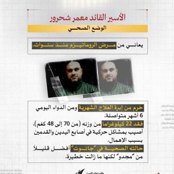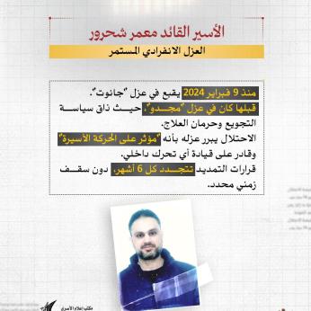 منذ 11 ساعة إعلام الأسرى: القائد الأسير محمد عرمان (50 عاماً) من رام الله، والمحكوم بالسجن المؤبد (36 مرة)، يواجه أوضاعاً صحية ومعيشية قاسية في عزل سجن مجدو، حيث خسر كثيراً من وزنه حتى بات لا يتجاوز الـ 60 كيلوغراماً.
