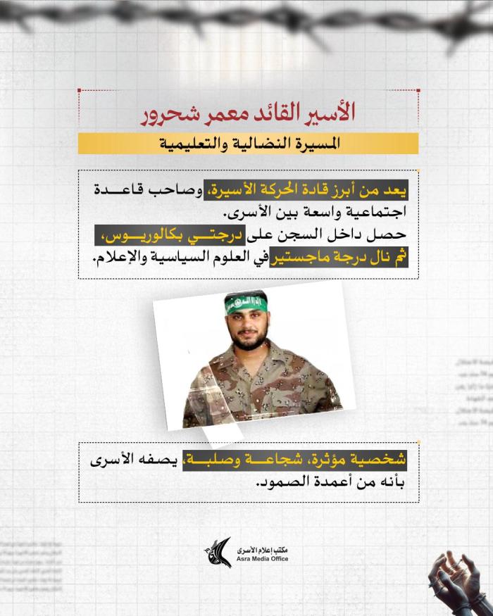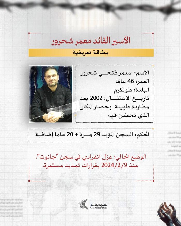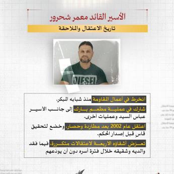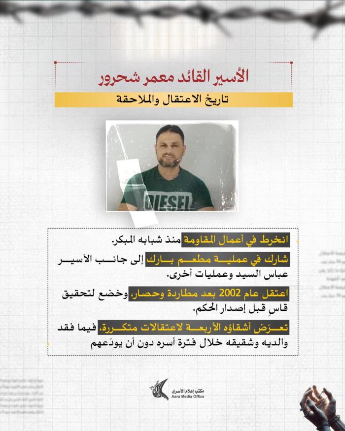 منذ 11 ساعة يقضي الأسير عمر العبد من بلدة كوبر شمال رام الله حكمًا بالسجن المؤبد أربع مرات داخل سجون الاحتلال الإسرائيلي، وقد أتمّ حفظ القرآن الكريم كاملًا خلال فترة اعتقاله