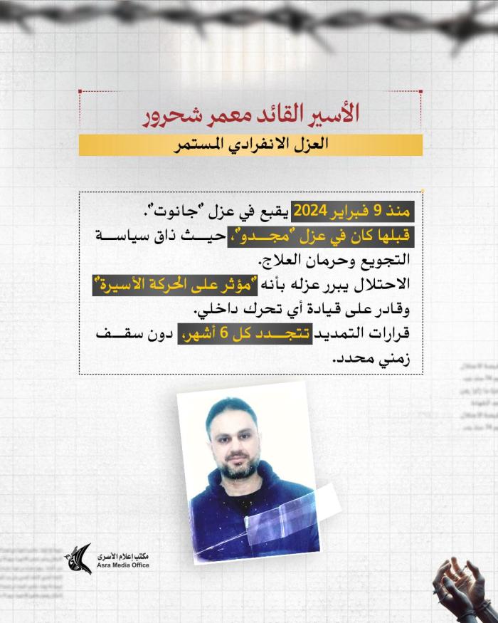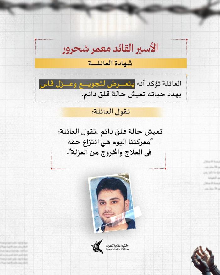 منذ 11 ساعة المكتب يحمل الاحتلال المسؤولية الكاملة عن حياته، مشدداً على أن ما يتعرض له يمثل انتقاماً مباشراً من رمزية القادة داخل السجون، وأن استمرار عزله وتجويعه يشكل تهديداً خطيراً لحياته.