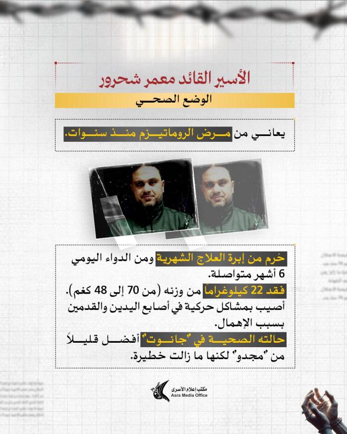 منذ 11 ساعة يؤكد مكتب إعلام الأسرى أن القائد عرمان يتعرض لسياسة تجويع ممنهجة وإهمال طبي ومحروم من العلاج والفحوص اللازمة. كما لم يعد هناك أي تواصل بينه وبين عائلته أو محاميه، ما يزيد القلق على مصيره.